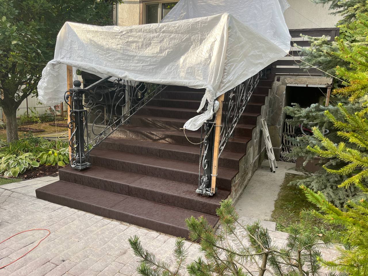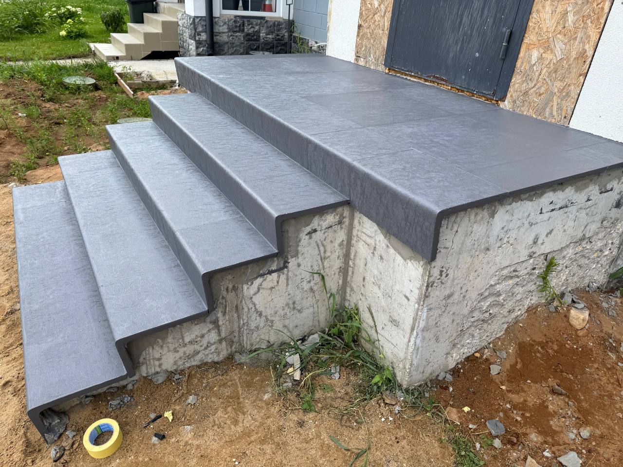 Облицовка крыльца материалами С3. В стоимость проекта входит: все необходимые материалы и расходники, демонтаж, реставрация основания, монтаж, затирка, покраска, сбор мусора.